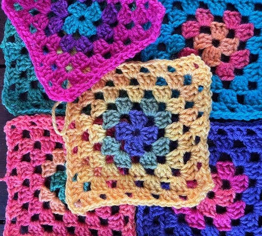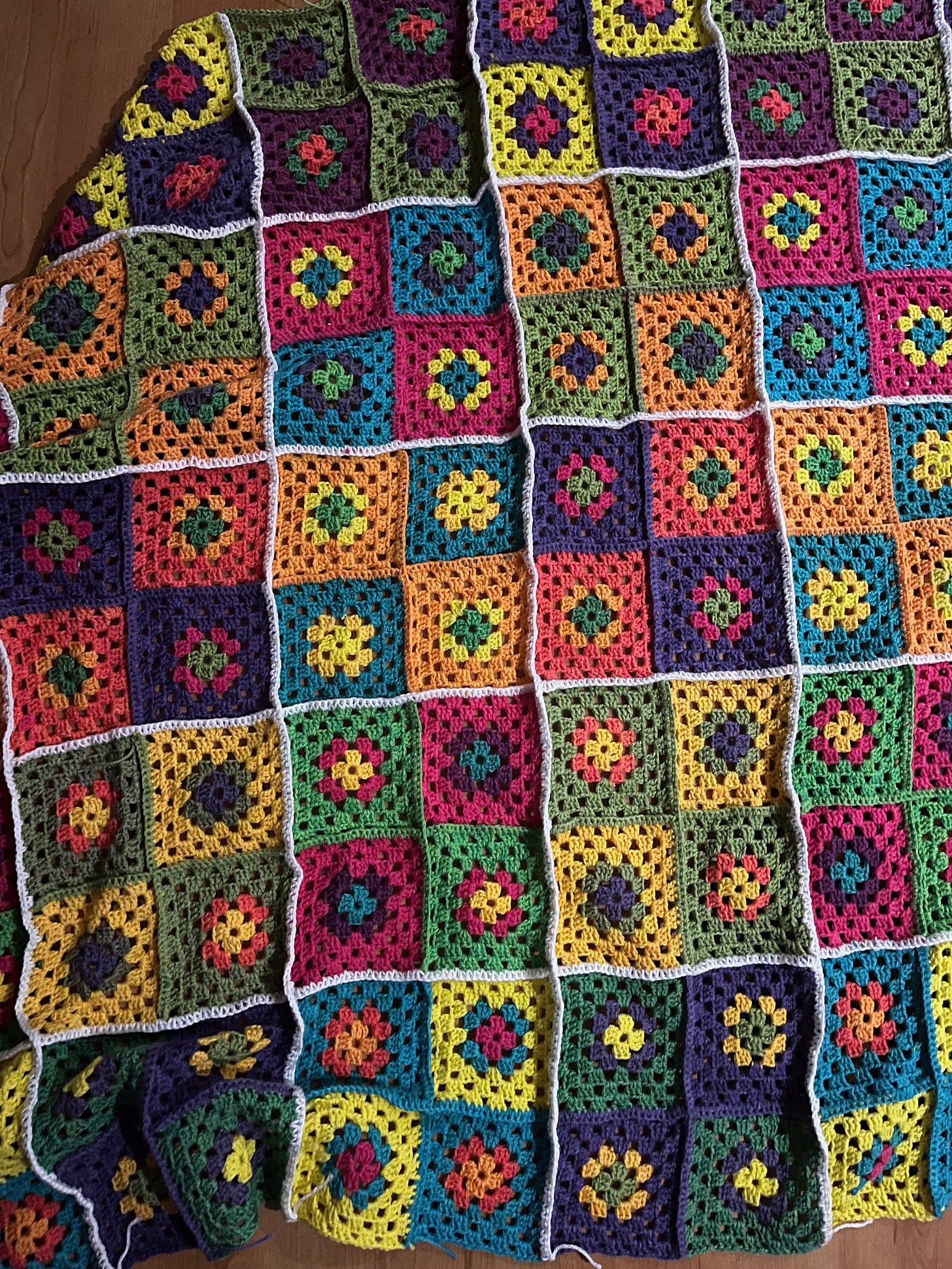 Fortunately, no abs required to crochet. The six multi-coloured grannies are now part of a blankie. It currently looks like this [I’m still not sure about the white]: